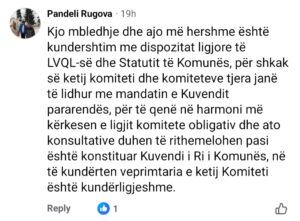 “Kjo mbledhje dhe ajo më hershme është kundershtim me dispozitat ligjore të LVQL-së dhe Statutit të Komunës, për shkak së ketij komiteti dhe komiteteve tjera janë të lidhur me mandatin e Kuvendit pararendës, për të qenë në harmoni më kërkesen e ligjit komitete obligativ dhe ato konsultative duhen të rithemelohen pasi është konstituar Kuvendi i Ri i Komunës, në të kundërten veprimtaria e ketij Komiteti është kundërligjeshme.”- thotë ai.