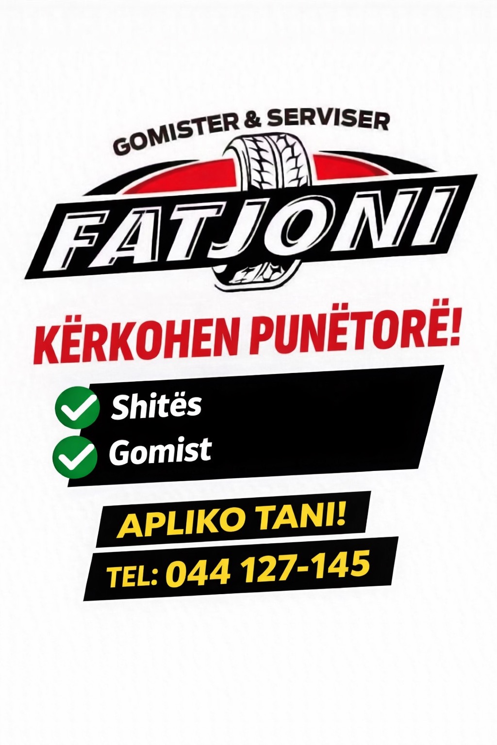 Gomister Fatjoni në qytetin e Pejës, një biznes i besueshëm dhe i suksesshëm i shërbimeve të gomave për makina, kërkon 3 punëtorë të motivuar dhe të përkushtuar për t’u bashkuar me ekipin e tij.