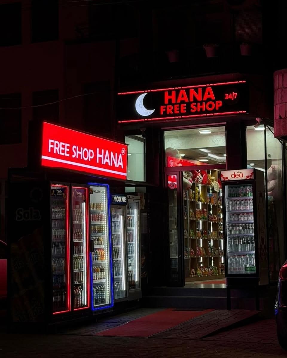 “Hana”, një free shop me koncept të ri që funksionon 24/7, ndodhet në rrugën “Nënë Tereza”, në drejtim të spitalit, si dhe ofron produkte të ndryshme të domosdoshme për qytetarët, në çdo moment të ditës dhe natës.