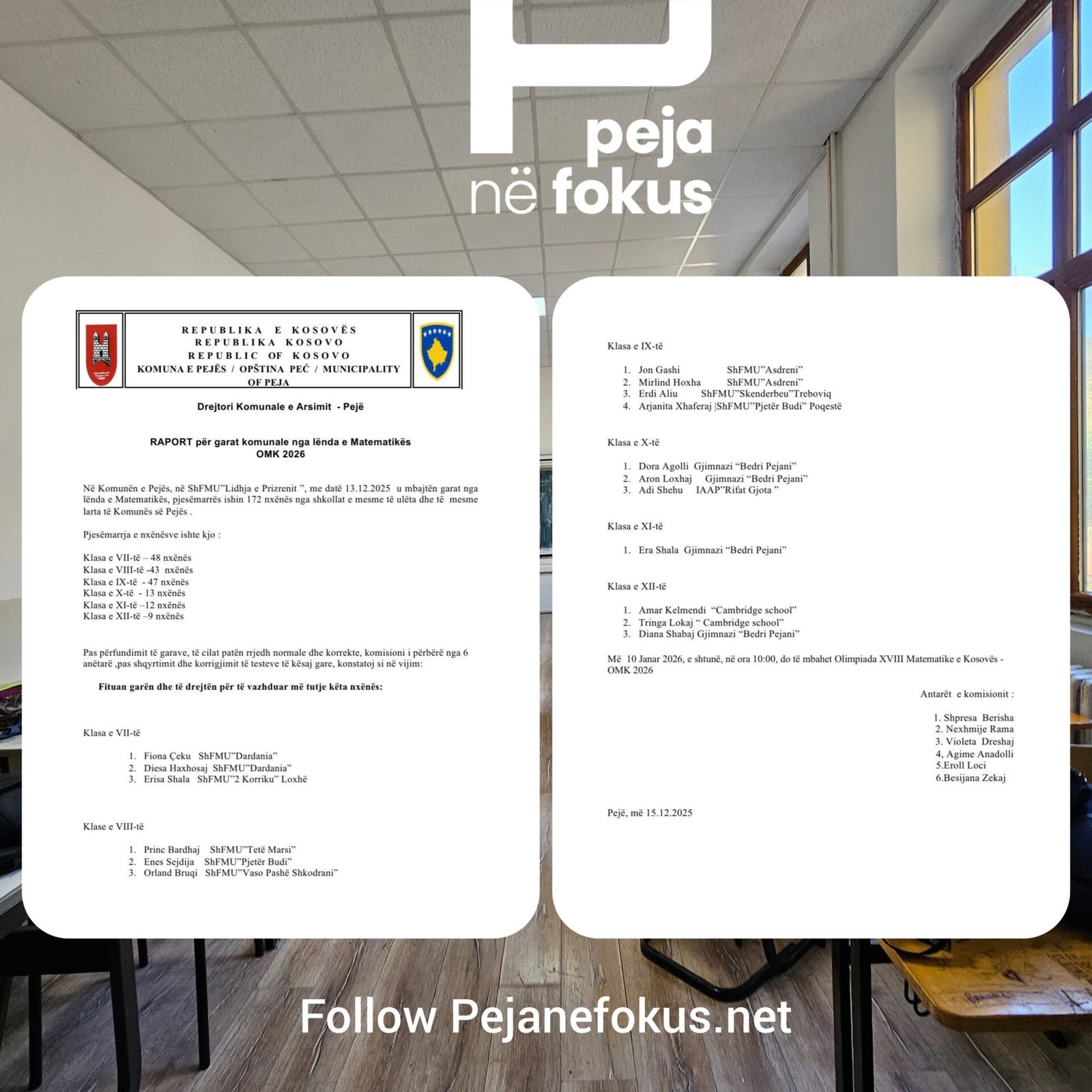 Në Komunën e Pejës, më 13 dhjetor 2025, në SHFMU “Lidhja e Prizrenit”, u mbajtën garat komunale nga lënda e Matematikës, në të cilat morën pjesë 172 nxënës nga shkollat e mesme të ulëta dhe të mesme.