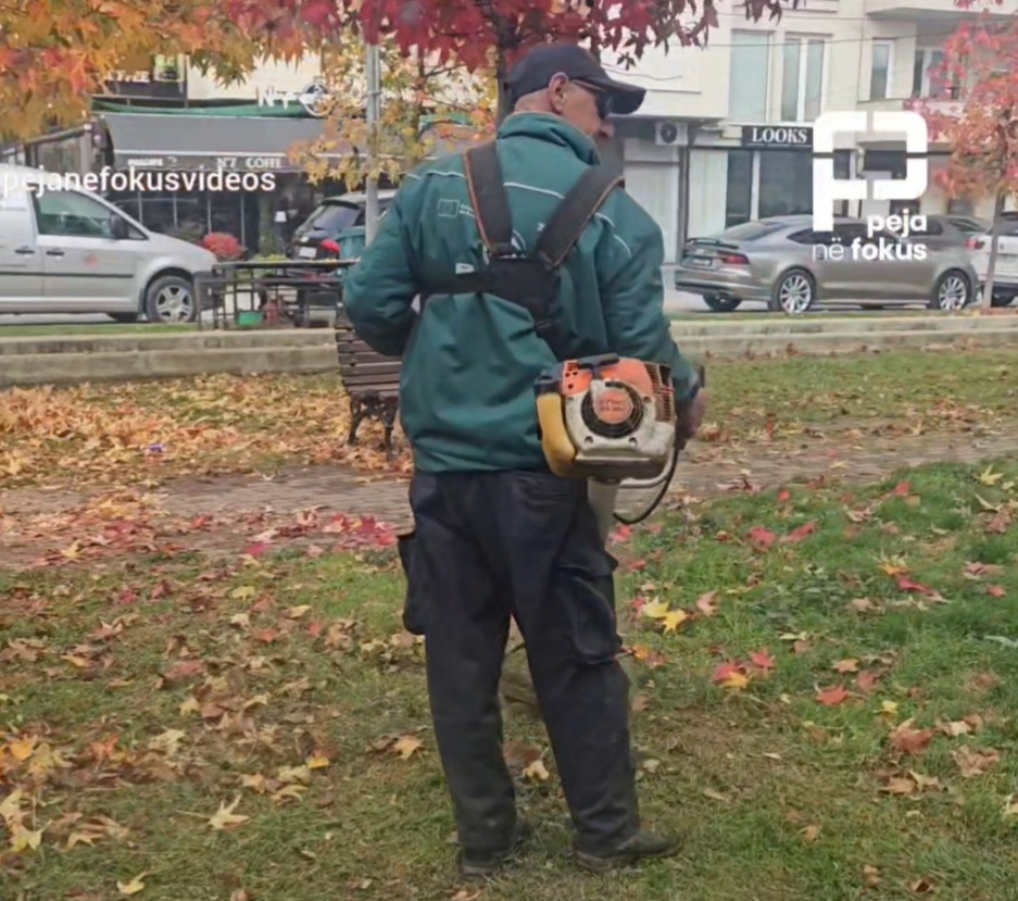Pamjet paraqesin pastrimin e gjetheve të bukura të drunjëve në parkun, afër Qendrës Zejtare në Pejë.